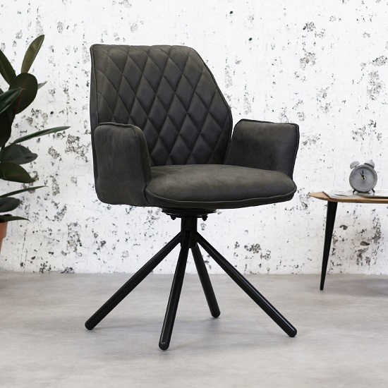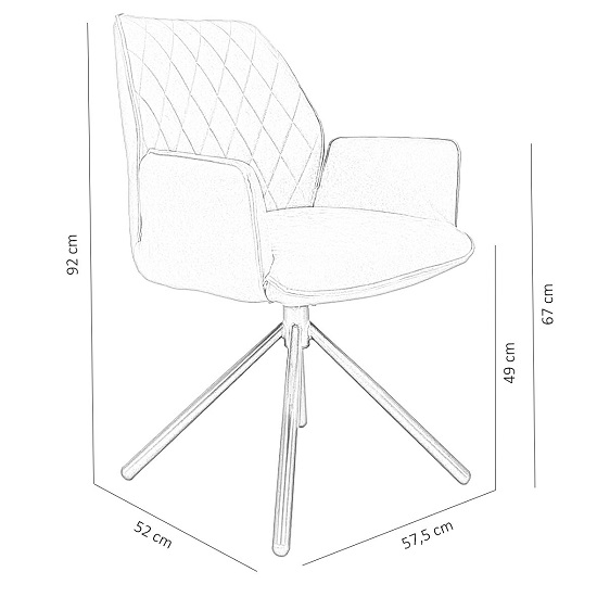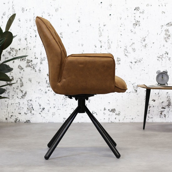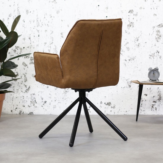De draaibare eetkamerstoel met armleuning heeft een kruispoot met een stevige uitstraling.
