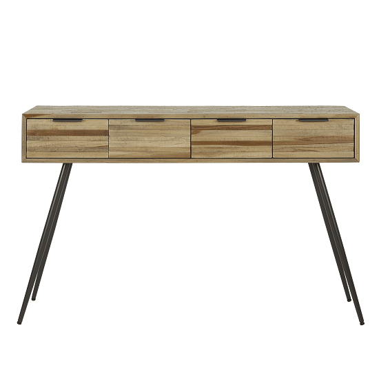 Haltafel teakhout industrieel is uitgevoerd in verweerd teakhout, gelegd in strookjes met aan de voorzijde opgelegde strips van hetzelfde hout.