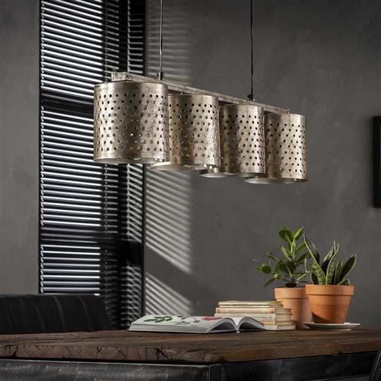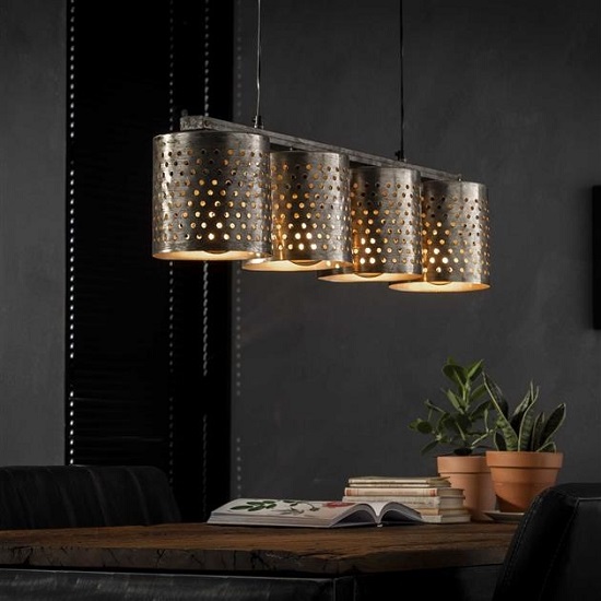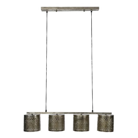De hanglamp is uitgevoerd met vier ronde geperforeerde kappen aan een recht armatuur.