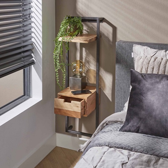 Ontdek het stijlvolle en functionele nacht kastje van massief acaciahout, perfect voor iedere slaapkamer. Dit zwevende nachtkastje combineert een moderne uitstraling met natuurlijke look, waardoor het een prachtige toevoeging is aan jouw interieur. Het gebruik van acaciahout zorgt voor een unieke en warme uitstraling, terwijl het metaal een industriële touch toevoegt.