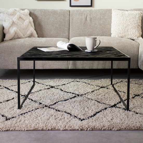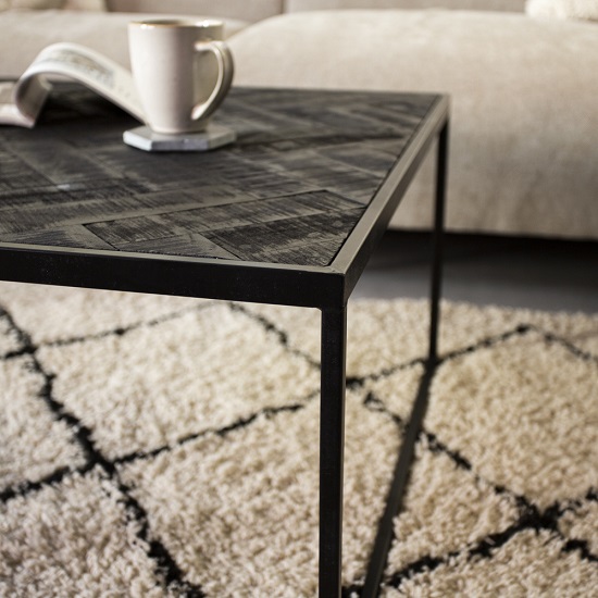 De salontafel is zwart en stoer en bevat een visgraat structuur dit geeft karakter aan iedere interieur.