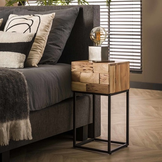 Dit nachtkastje is uitgevoerd in acacia hout met een metalen frame.