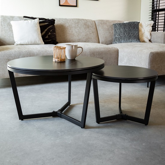 Salontafel rond marmer zwart bestaande uit twee ronde tafeltjes.