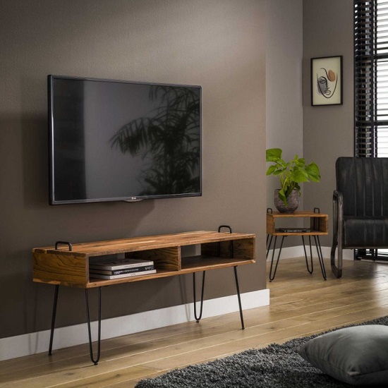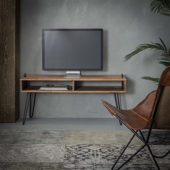 Tv meubel industrieel open vakken uitgevoerd in massief acacia hout met twee open vakken.